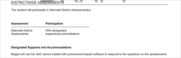 This page of the IEP notes the student’s participation level in both district and statewide assessments. Which assessments will the student participate in, and will they participate with or without designated supports/accommodations? What are those designated supports and/or accommodations?