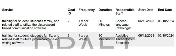 This page of the IEP documents all accommodations and modifications the student is entitled to, including AT devices and services. This documentation is critical to the IEP and ensures they’ll have access to the same devices and services even if they change school districts.